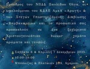Το καθιερωμένο ετήσιο Χριστουγεννιάτικο Bazaar του ΚΔΑΠ ΑμεΑ «Αρωγή» και των Στεγών Υποστηριζόμενης Διαβίωσης «Βαμβακάρειο» θα πραγματοποιηθεί στις 6 και 7 Δεκεμβρίου, από τις 10:00 έως τις 19:00, , στο χώρο των δομών (Μπόσκιζας & Πλαταιών 23Α).