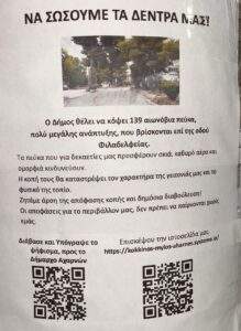 Η Λ. Φιλαδελφείας πέρα από τον ΑΓΩΓΟ ΟΒΡΙΩΝ ΥΔΑΤΩΝ χρειάζεται ΠΕΖΟΔΡΟΜΙΑ με ΤΕΧΝΙΚΕΣ ΠΡΟΔΙΑΓΡΑΦΕΣ ,που να πληρούν τους όρους ασφάλειας Για το παιδί , για την μαμά με το καρότσι, Για τον ηλικιωμένο, και ΠΡΟΣΒΑΣΙΜΑ για τον συνάνθρωπό μας με κινητικά θέματα ΑμεΑ, Χρειάζεται ΑΠΛΕΤΟ ΦΩΣ να χαθούν τα σκοτάδια , και τον ΦΥΣΙΚΟ ΠΛΟΥΤΟ που είμαστε ΤΥΧΕΡΟΙ που διαθέτουμε τα ΔΕΝΤΡΑ πολύ απλά, χρειάζονται περιποίηση και φροντίδα δηλαδή πρωτίστως κλάδεμα και όποια από αυτά είναι ‘’άρρωστο’’ γνωμάτευση από πιστοποιημένο γεωπόνο και χρειάζεται κόψιμο να γίνεται άμεση αντικατάσταση…!!!