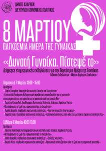 Ένα διήμερο ενημερωτικών εκδηλώσεων και σεμιναρίων γυναικείας ενδυνάμωσης διοργανώνει η Διεύθυνση Κοινωνικής Πολιτικής, Ισότητας και Δημόσιας Υγείας του Δήμου Αχαρνών με αφορμή την Παγκόσμια ημέρα της Γυναίκας που εορτάζεται στις 8 Μαρτίου.