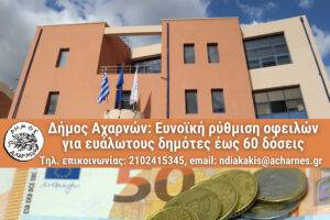 Ο Δήμος Αχαρνών ενημερώνει τους δημότες ότι μετά τη δημοσίευση του Ν. 5143/2024 στο ΦΕΚ, οι πολίτες έχουν τη δυνατότητα να ρυθμίσουν τις οφειλές τους προς τους Δήμους, σε έως 60 δόσεις.