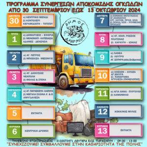 Ο Δήμος Αχαρνών ανακοινώνει το νέο πρόγραμμα αποκομιδής ογκωδών αντικειμένων της Διεύθυνσης Καθαριότητας και ανακύκλωσης για το διάστημα από 30 Σεπτεμβρίου έως και 13 Οκτωβρίου 2024.