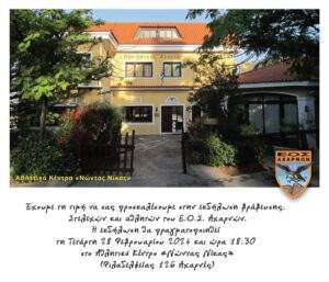 Πρόσκληση στην εκδήλωση βράβευσης των αθλητών και των στελεχών μας την ΤΕΤΑΡΤΗ 28 ΦΕΒΡΟΥΑΡΙΟΥ 2024 στις 18:30 στην έδρα του συλλόγου, Φιλαδελφείας 126, Αχαρνές.