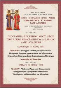 Το Σάββατο 18 Μαΐου 2024 θα τελεστούν τα εγκαίνια του Ιερού Ναού Αγίων Κωνσταντίνου και Ελένης Κάτω Αχαρνών (Λυκότρυπα) από τον Σεβασμιώτατο Μητροπολίτη Ιλίου, Αχαρνών και Πετρουπόλεως κ. Αθηναγόρα.