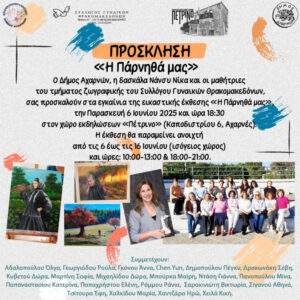 Ο Δήμος Αχαρνών, η δάσκάλα Νάνσυ Νίκα και οι μαθήτριες του τμήματος ζωγραφικής του Συλλόγου Γυναικών Θρακομακεδόνων σας προσκαλούν στα εγκαίνια της εικαστικής έκθεσης «Η Πάρνηθα μας» , την Παρασκευή 6 Ιουνίου 2025 και ώρα 18:30 στο χώρο εκδηλώσεων «Πέτρινο» (Καποδιστρίου 6, Αχαρνές).