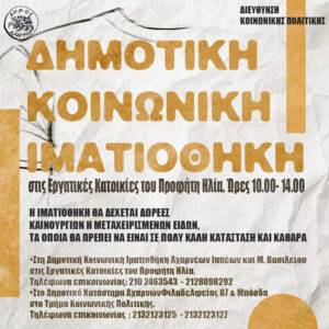 Δημοτική Κοινωνική Ιματιοθήκη: Αχαρνέων Ιππέων και Μ. Βασιλείου, Εργατικές Κατοικίες Προφήτη Ηλία. Τηλέφωνα επικοινωνίας: 210 2463543, 212 8098292