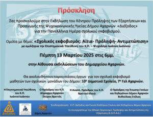 Με ιδιαίτερη χαρά, η Ένωση Συλλόγων Γονέων και Κηδεμόνων Δήμου Αχαρνών, σε συνεργασία με το Κέντρο Πρόληψης «Διέξοδος», σας προσκαλεί σε μια σημαντική εκδήλωση αφιερωμένη στον σχολικό εκφοβισμό.