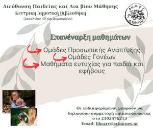 Η Διεύθυνση Παιδείας και Διά Βίου Μάθησης του Δήμου Αχαρνών ανακοινώνει την επανέναρξη των πετυχημένων ομάδων προσωπικής ανάπτυξης και βελτίωσης, των ομάδων γονέων και των μαθημάτων ευτυχίας για παιδιά και εφήβους που θα λειτουργήσουν για άλλη μια χρονιά στην Κεντρική Δημοτική Βιβλιοθήκη Αχαρνών με πρωτοβουλία της αρμόδιας Αντιδημάρχου,Χριστίνας Κατσανδρή.