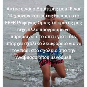 «Αυτός είναι ο Δημήτρης, ο γιος του Γιώργου και της Μαρίνας. Ο Δημήτρης είναι ένας υπέροχος νεαρός ΑΜΕΑ που μαζί με άλλα 4 παιδιά του δήμου Σαρωνικού έμειναν εκτός σχολικού πλαισίου καθώς το ΕΕΕΚ Ραφήνας ισχυρίζεται πως η περιφέρεια ΔΕΝ προβλέπει σχολικό για αυτά τα παιδιά, και η Περιφέρεια ρίχνει το μπαλάκι στο σχολείο οτι εκείνο ευθύνεται που δεν υπάρχει σχολικό να περνάει να παραλαμβάνει τα παιδιά.