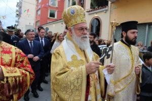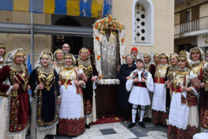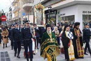Μετά την απόλυση της Θείας Λειτουργίας επακολούθησε λιτανευτική πομπή της εικόνος και των λειψάνων του αγίου με παραστάτες αγόρια και κορίτσια του Λυκείου Ελληνίδων, τα οποία φορούσαν παραδοσιακές στολές.