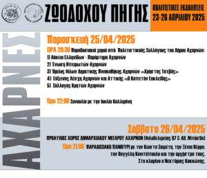 Αμέσως μετά εγκαίνια της έκθεσης «Αχαρνές: Μία πόλη γένους θηλυκού» που συνδιοργανώνουν ο Δήμος Αχαρνών και ο Όμιλος Φίλων Δημοτικής Πινακοθήκης «Χρήστος Τσεβάς» στη Δημοτική Πινακοθήκη. (Διάρκεια Έκθεσης: 24-25 Απριλίου 2025, Ώρες έκθεσης: 10:00 – 13:30 & 18:30 – 21:00).