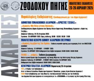 Το πανηγύρι της Ζωοδόχου Πηγής είναι ένα από τα πλέον ιστορικά που πραγματοποιούνται στην Αττική. Ανέκαθεν συγκέντρωνε πλήθος κόσμου, καθώς αποτελούσε ορόσημο όχι μόνο για τις Αχαρνές, αλλά και για τους όμορους δήμους. Ο Δήμος Αχαρνών συνεχίζει να τιμά την παράδοση και να διοργανώνει εορταστικές εκδηλώσεις που αναδεικνύουν τον πολιτισμό της πόλης, ενώ παράλληλα προσφέρουν μια ευκαιρία δωρεάν ψυχαγωγίας και διασκέδασης για όλους τους δημότες.