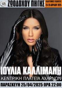 Το βράδυ της Παρασκευής, ανήμερα της εορτής, η κεντρική πλατεία θα φιλοξενήσει την Ιουλία Καλλιμάνη. Πλέον ένα από τα μεγαλύτερα ονόματα του λαϊκού τραγουδιού, που γεμίζει ασφυκτικά κάθε χώρο που επιλέγει να τραγουδήσει.