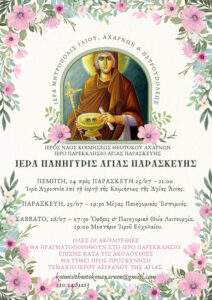 Πανήγυρις Παρεκκλησίου Αγίας Παρασκευής του Ι.Ν. Κοιμήσεως Θεοτόκου Αχαρνών, στις 25 και 26 Ιουλίου 2025.
