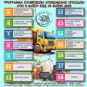 Η Διεύθυνση Καθαριότητας & Ανακύκλωσης του Δήμου Αχαρνών, ανακοινώνει το νέο πρόγραμμα αποκομιδής ογκωδών αντικειμένων με στόχο τον καλύτερο συντονισμό και την αποφυγή άσκοπης παραμονής τους στους δρόμους.