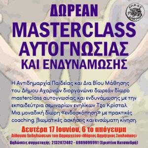 ΔΩΡΕΑΝ Δίωρο Masterclass Αυτογνωσίας και Ενδυνάμωσης διοργανώνει η Αντιδημαρχία Παιδείας και Δια βίου Μάθησης, τη Δευτέρα 17 Ιουνίου, στις 6 το απόγευμα με την εκπαιδεύτρια σεμιναρίων ενηλίκων, Τζο Κρίσταλ.