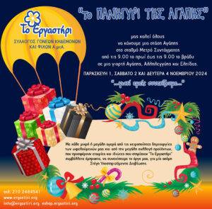 Στις 1,2 και 4 Νοεμβρίου, «Το Εργαστήρι» Σύλλογος Γονέων Κηδεμόνων και Φίλων Α. με. Α, διοργανώνει για μια ακόμη χρονιά το «ΠΑΝΗΓΥΡΙ ΤΗΣ ΑΓΑΠΗΣ 2024»,στην αίθουσα πολλαπλών εκδηλώσεων του μετρό Συντάγματος, από τις 9 το πρωί έως τις 9 το βράδυ.